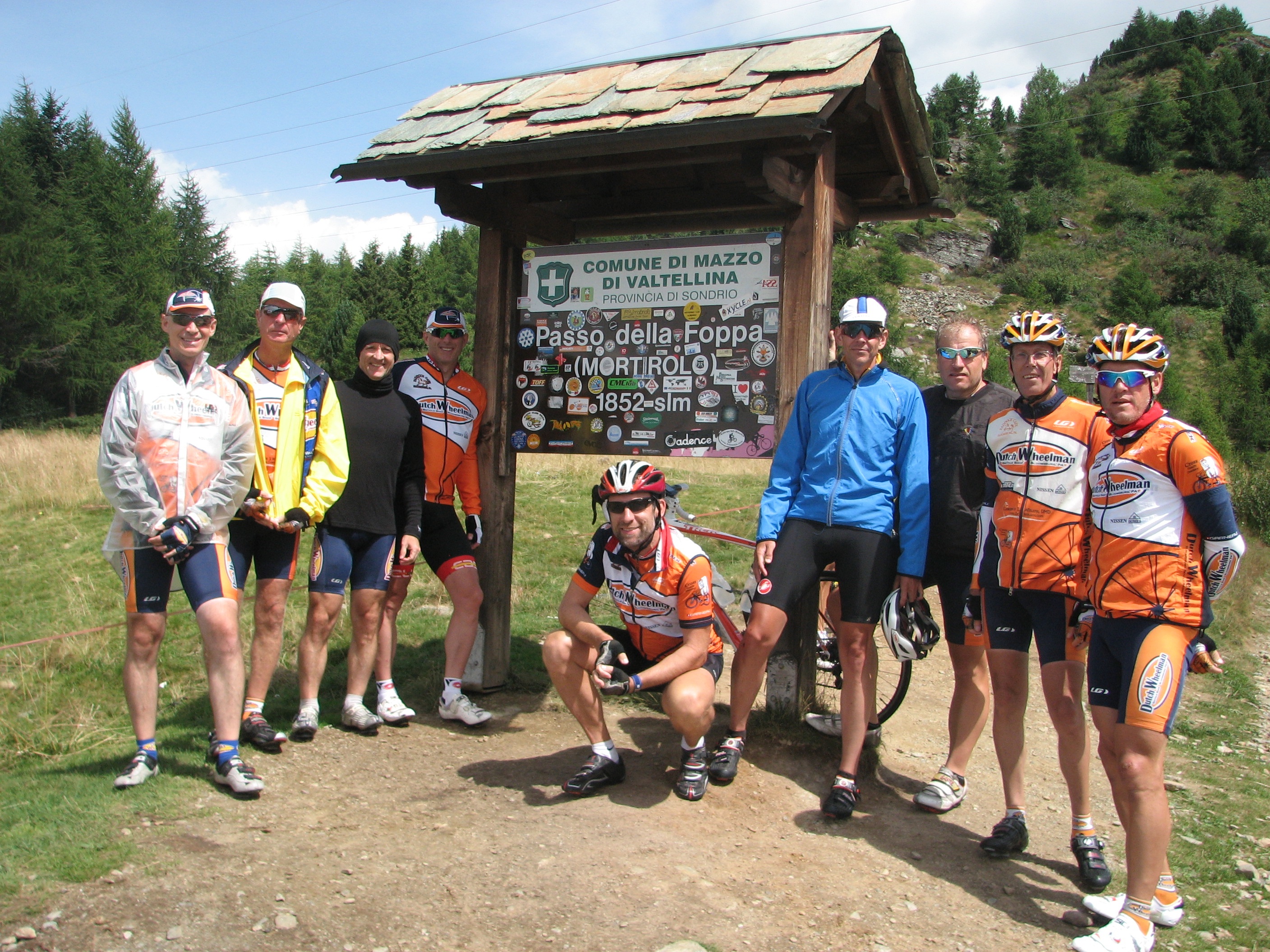 Today we set out to ride the Mortorolo,which translated means “Mountain of Death” It was by far the toughest climb we encountered. Most of the road up was just wide enough for one car. When Cheryl and Cindy were met by another car, one of them had to back up to a wide enough space for passing. The climb was mainly 10-16% and we all were all happy to make it to the top. This was to be our 18,000 ft day, but very bad weather on the Bernina climb, made us pack it in for the day. Just about everyone was dealing with colds already. A big plus for the day was that Ken was allowed to get on his bike again and rode very strong to the top of the Mortorolo.